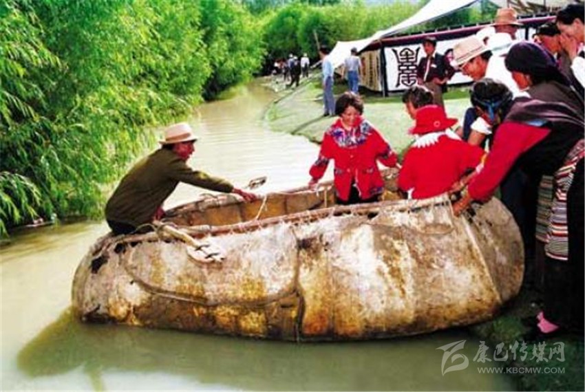 牛皮船,顧名思義是牛皮做的船,做牛皮船的材料很簡單,只用木料和牛皮。木頭要選用韌性較好的樹木做骨架,把泡軟、牛毛基本褪凈的4張牦牛皮縫起來,并將濕牛皮包在木骨架上繃好,用牛皮繩子捆緊、曬干、擦油定型,再把牛皮縫口接頭處擦抹大量牛、羊油以便將接縫密封,避免進(jìn)水,再配上一對(duì)劃槳,就可以下水使用了,一只牛皮船只需一個(gè)船夫。