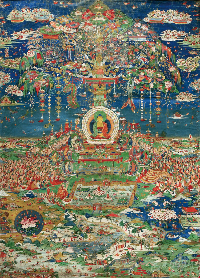 具有超越凡人的精微刻畫能力,也使得郎卡杰在面對(duì)畫布時(shí),有更廣大的空間來(lái)展示他的繪畫天賦。從存世的作品《無(wú)量光佛凈土》中,看得出郎卡杰喜歡將自己的“毫毛畫師”的能力發(fā)揮到極致。不管是花紋、瓔珞、還是人物,但凡是畫面上出現(xiàn)的物象,他都會(huì)以精致、繁密的形式出現(xiàn)。所以他的畫面世界里往往都是人山人海、琳瑯滿目;盈寸之間,容納萬(wàn)千;場(chǎng)面浩瀚、氣勢(shì)恢宏、不可思議!