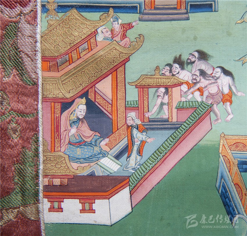 再看《如意寶藤》的另一個(gè)局部,對(duì)比唐卡裱邊,我們可以看出大約十公分見(jiàn)方的畫面里,郎卡杰描繪了十個(gè)人物和一棟宮殿,畫面還顯得很疏朗;圍墻外的“邪魔外道”身上不僅分染了體積,還描繪了五官須眉和汗毛。漢式宮殿內(nèi)外墻磚上,還刻畫了精微的花紋和裝飾,郎卡杰的“神變”畫技由此可見(jiàn)。而這樣的微型畫中畫,在郎卡杰作品中大量存在,精彩絕倫。圖二《如意寶藤》局部