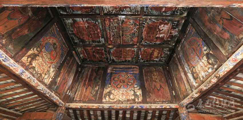 在介紹的過程中,我發(fā)現(xiàn)這座小寺不簡(jiǎn)單,很想到正殿看看。到了殿里,我發(fā)現(xiàn)殿內(nèi)佛像具備,壁畫、板畫以及唐卡數(shù)量眾多,皆是工藝精湛。廟宇四檐有青銅制風(fēng)鈴4個(gè),但是一樓的壁畫看著像是維修過。