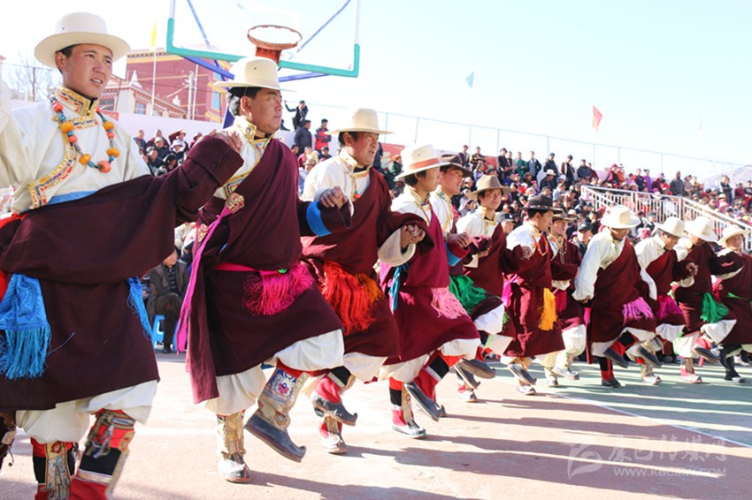 弦子比賽開始了。精神矍鑠,頭戴紅須“嗦啊”的扎西第一個(gè)出場(chǎng)。白色“仙子”(藏式襯衫)的長袖一層層疊到手腕,藍(lán)緞子藏式背心在陽光的映襯下,顯得格外光亮耀眼。一把彩色弦胡抵在左腰,左手幾個(gè)指姆在馬尾琴弦上靈動(dòng)地起落按擦,右手輕松自如地拉動(dòng)琴弓,琴弦伸縮間,琴筒里發(fā)出悠揚(yáng)的弦子聲。他扯開嗓子起音,聲音宏亮,身后十一個(gè)胡琴手齊拉共唱,后面一百多位著盛裝的男女舞者動(dòng)作整齊劃一,一個(gè)回環(huán)往復(fù)的圓圈逐漸形成,原生態(tài)歌聲化漾開去,從廣場(chǎng)的四面八方升騰起來,在天際飄蕩: