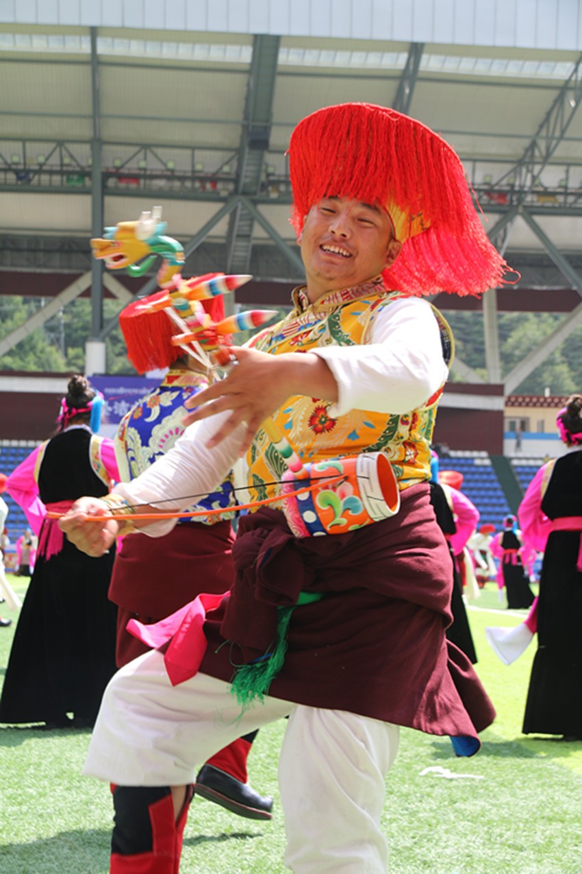 扎西腳蹬紅黑相間的藏式手工皮靴,提腿、反跨、揭回、點(diǎn)輾,系在腰間的紫紅色藏袍隨著弦律微微擺動(dòng),體態(tài)輕盈,溝壑縱橫的臉上洋溢著笑容。臺(tái)上的評(píng)委頻頻點(diǎn)頭,四周的觀眾紛紛鼓掌:“你看,扎西‘羌魯’跳得多好!‘諧本’就該是這樣!”