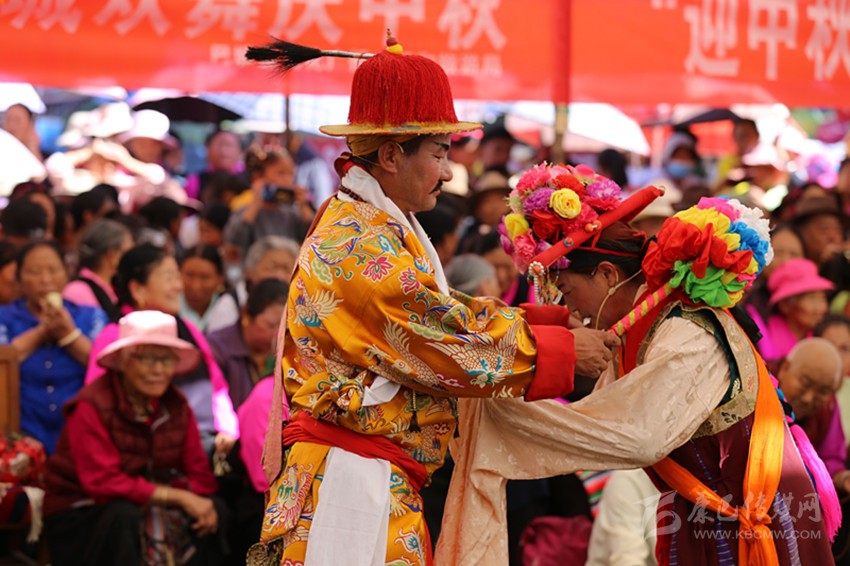 九月,龍王塘,藏戲《嘎拉旺布》演出現(xiàn)場。西繞反串花仙卓瓦桑姆,他頭戴花冠,頂上的三叉“巴珠”(后藏女人的一種頭飾)上插滿了粉色和紅色的絹花。身上穿著各色綢緞拼制成的無袖藏袍“拉姆切”,上套無袖彩條花氆氌帶和藍綠花緞帶連綴成的褂子。踩著鼓與鈸敲擊出的節(jié)奏,他的兩只腳進、頓、點、退,舞步輕盈,手腕跟隨節(jié)奏,以頭部和肩部為限,左舞右蹈,用肢體語言表現(xiàn)人物的思想感情,這是該劇第一幕《定情月下》:湖畔仙景,卓瓦桑姆偕眾仙女婆娑起舞。國王隨仙鹿而來,向卓瓦桑姆傾訴衷情,花仙為國王的真情所動,愿永結(jié)同心。仙翁降臨贈箭祝福,二人辭別眾仙……。炎炎烈日下,西繞薄施脂粉的面頰已被幾行汗水弄花,但他不以為意,此時此刻,他不是西繞,而是花仙卓瓦桑姆。從進場伊始,他便與角色融為一體。周遭的觀眾認真觀看、解讀,現(xiàn)場一片和諧,最美的時光在這一刻被盡情雕刻。