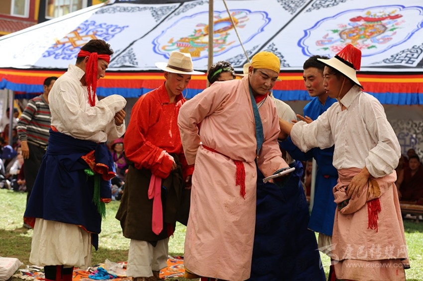 跳完《江嘎冉》和《扎西協(xié)哇》,藏戲團的長者會告訴觀眾本次“央勒節(jié)”將要演的正劇名目。要在一周內(nèi)演完七大藏戲是不可能的,完整地演完一出戲需要十天半個月,因而通常都是取其中的折子戲演。如果是《文成公主》,專演祿東贊求親或是公主進藏那段;若是《郎莎姑娘》,其受虐待被折磨的一處是必演的。有些婆婆對媳婦不好,人們就會嘲諷:“這些婆婆娘看朗莎姑娘受苦的戲時淚流滿面,回家面對媳婦時就忘了戲里的人了!”