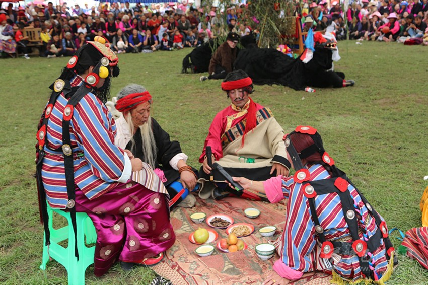 無論是小時候還是現(xiàn)在,“央勒節(jié)”都是我們期盼的節(jié)日,看不懂藏戲,但必須去湊鬧熱,否則這一年就有缺憾。父親作為家中老大,節(jié)前一個月會組織他的兄弟姐妹們開個家庭會議,商議湊錢、做飯、家什等各種細小瑣事,然后派出家族中幾個壯勞力去“龍王塘”約定束成的地盤上拔草、平地、做記號,表明“德嘎”家族今年還要在這個地方搭帳篷,其他人家看到記號,不會再來占地盤。節(jié)日前一天,稱為“亞堆”,不管有多麻煩,都要在這一天把家搬下去,晚上守帳篷的通常是堂姐夫,做飯洗碗則是我們姐妹們的任務(wù)?!褒埻跆痢庇袃裳蹨厝捎谒|(zhì)的原因,酥油茶和冒面與自來水做出來的不是一個味兒,非常清香。特別喜歡“央勒節(jié)”之夜,它是一首詠嘆調(diào):浩瀚的星光下,巴楚河的潮汐恢宏豐沛,金沙江在九公里處等待它的匯入;“龍王塘”幾百個帳篷透出光亮,依稀可見人影綽綽,“好風如水,清景無限”,巴塘人對閑適生活的追求在這一刻表達得淋漓盡致。我們期待著藏戲的鼓鈸和唱腔悠揚婉轉(zhuǎn)地傳入帳篷中,做什么都有心情,勁頭十足。
