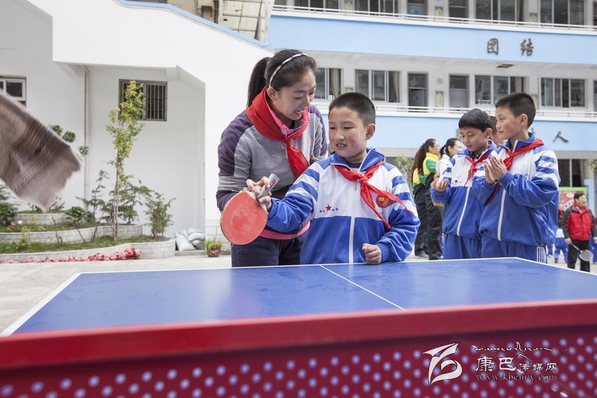 乒乓球冠軍牛劍鋒手把手教東大街小學(xué)學(xué)生打球。