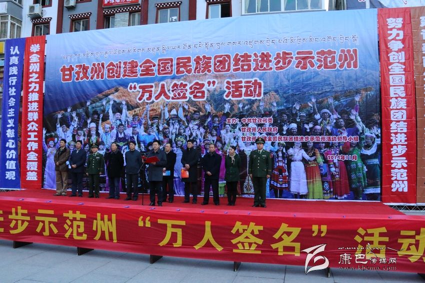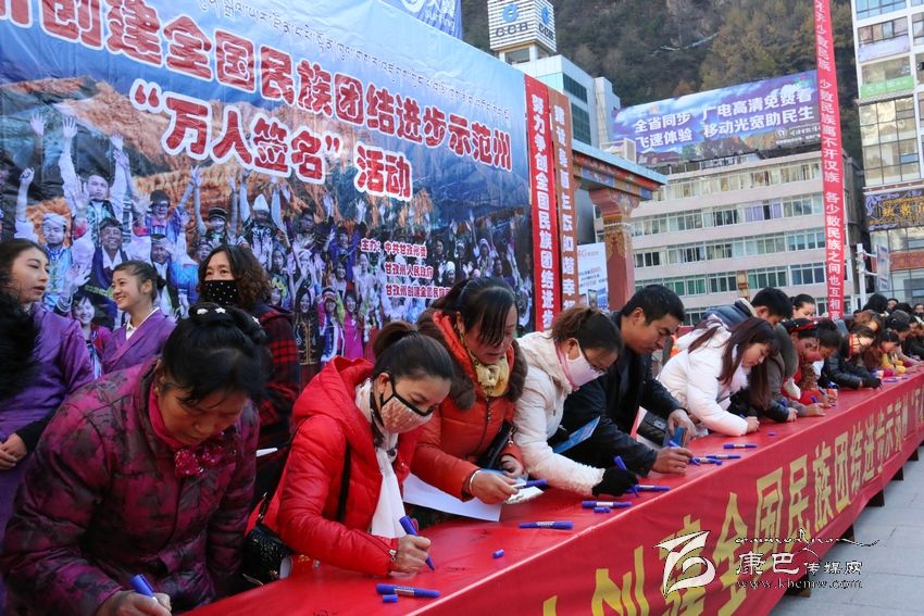 州人大常委會(huì)副主任李致民宣布創(chuàng)建全國(guó)民族團(tuán)結(jié)進(jìn)步示范州“萬(wàn)人簽名”活動(dòng)正式開(kāi)始后,州領(lǐng)導(dǎo)汪洋、李致民、楊國(guó)元、范文華、蔣秀英、楊學(xué)康以及甘孜軍分區(qū)、駐州武警部隊(duì)領(lǐng)導(dǎo)同州級(jí)機(jī)關(guān)、志愿者、個(gè)體工商戶、學(xué)生、駐軍、政法干警、康定縣黨政機(jī)關(guān)干部代表近千人,陸續(xù)到“萬(wàn)人簽名”條幅上簽下了自己的姓名。