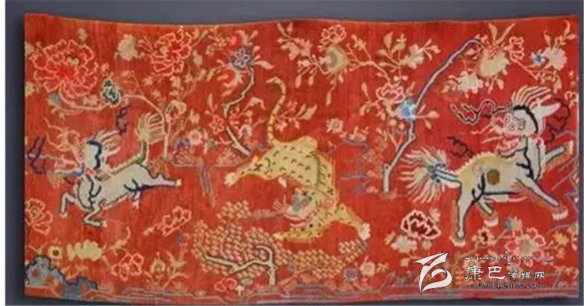 織制有麒麟、老虎和獅子的彩色掛毯寓意著福、祿、壽,是從前達官顯貴們重要家裝飾品之一。此掛毯上的動物與花朵造型古樸,雖然已歷經(jīng)歲月,然而色澤依舊鮮艷如初。
