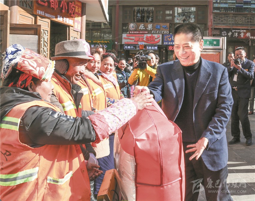 “你們每月工資多少?都按時領到了嗎?”在將軍橋環(huán)衛(wèi)點,劉成鳴與環(huán)衛(wèi)工人親切交談,并一一握手問好。劉成鳴代表州四套班子向奮戰(zhàn)在環(huán)衛(wèi)戰(zhàn)線上的全體干部職工致以崇高敬意和新春問候,對環(huán)衛(wèi)工人為創(chuàng)造康定潔凈、舒適、優(yōu)美的市容環(huán)境所付出的辛勤勞動表示衷心感謝。他說,環(huán)衛(wèi)工作特別辛苦,又臟又累,環(huán)衛(wèi)工人以“寧愿一人臟、換來萬人潔”的奉獻精神,起早摸黑,頂風冒雪,不畏嚴寒,埋頭苦干,特別在去年我州舉辦一系列重大節(jié)慶活動中出色完成了工作任務,在平凡的工作崗位上做出了不平凡的業(yè)績,為推動我州經(jīng)濟社會發(fā)展作出了積極的貢獻。他希望大家在新的一年里,再接再厲,繼續(xù)發(fā)揚無私奉獻精神,立足本職,愛崗敬業(yè),努力拼搏,再創(chuàng)佳績,把康定打扮得更加靚麗、更加美好,為城市環(huán)境衛(wèi)生建設做出新的貢獻。