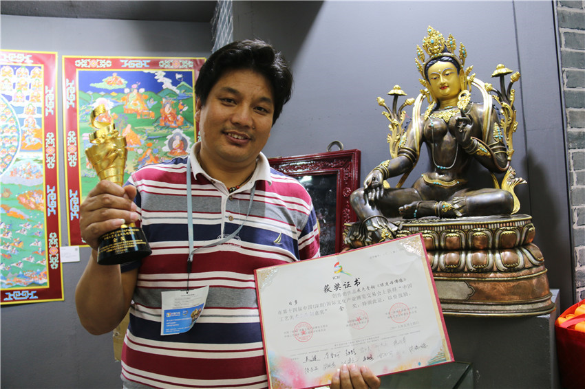 本網(wǎng)訊(記者 宋志勇 文/圖)5月14日,歷時5天的2018年第十四屆中國(深圳)國際文化產(chǎn)業(yè)博覽交易會(以下簡稱深圳文博會)圓滿落幕。我州憑借花色青銅《綠度母佛像》作品摘得“中國工藝美術(shù)文化創(chuàng)意獎”金獎,成為本屆文博會大眾關(guān)注的焦點。