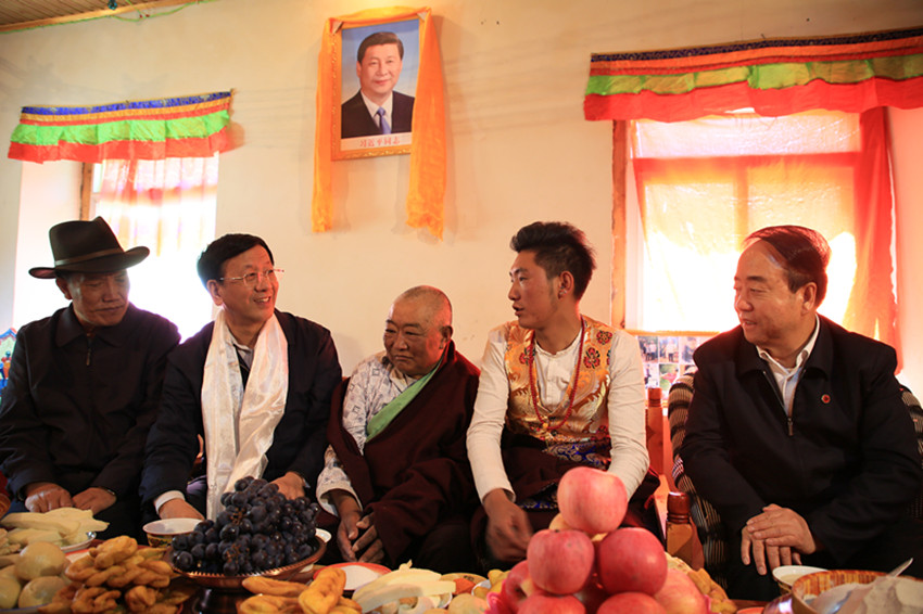 曹建明在康定市瓦澤鄉(xiāng)水橋村村民洛布家中調(diào)研。
