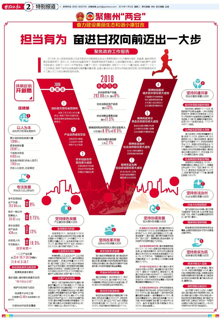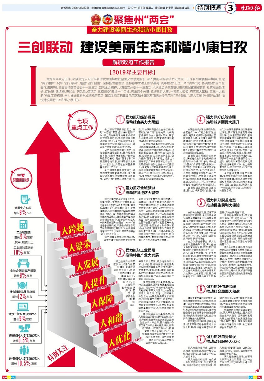 2019年預(yù)期全州地區(qū)生產(chǎn)總值增長8%左右,工業(yè)增加值增長9%左右,全社會固定資產(chǎn)投資增長8%左右,社會消費品零售總額增長12%左右,地方一般公共預(yù)算收入增長9%左右,城鎮(zhèn)居民人均可支配收入增長8.5%左右,農(nóng)村居民人均可支配收入增長10.5%左右,全州5個貧困縣將“摘帽”……