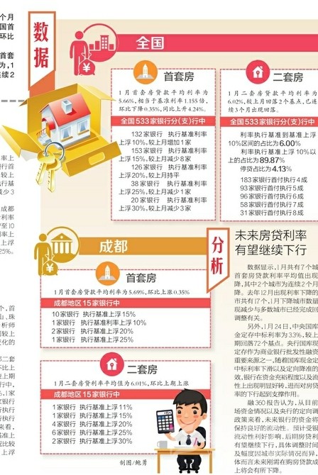 其中,上海首套房貸利率較上月持平仍為最低,成都首套房貸利率平均值為5.69%,環(huán)比上漲0.35%。分析師認(rèn)為,1月利率下調(diào)銀行數(shù)量較上月減少,首套平均利率出現(xiàn)連續(xù)2個(gè)月下降,未來利率整體繼續(xù)回落的可能性較大。