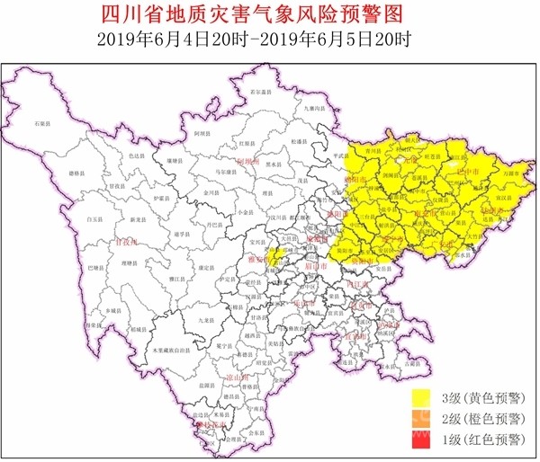 四川在線消息(記者 寇敏芳)6月4日,省自然資源廳發(fā)布全省地災(zāi)氣象風(fēng)險預(yù)警。結(jié)合四川省氣象臺天氣預(yù)報情況,6月4日20時~6月5日20時,全省地質(zhì)災(zāi)害氣象風(fēng)險預(yù)警等級為3級(黃色預(yù)警,注意級),具體結(jié)果如下: