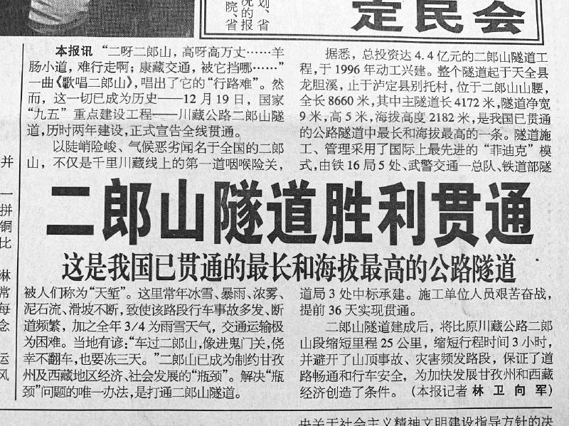 二郎山老路交通瓶頸,影響到甘孜州及西藏地區(qū)經(jīng)濟社會發(fā)展。1996年,二郎山隧道開建,歷時2年,于1998年底貫通?!岸缮剿淼喇?dāng)時是全國最長、海拔最高、地質(zhì)最復(fù)雜的公路隧道,建設(shè)很不容易。”林衛(wèi)回憶,當(dāng)年采訪建設(shè)二郎山隧道的鐵道部隧道局三處和武警交通一總隊時,曾聽聞隧道開挖中遇到的各種危險,一名現(xiàn)場指揮長就曾被卷入洪水,所幸后來死里逃生。