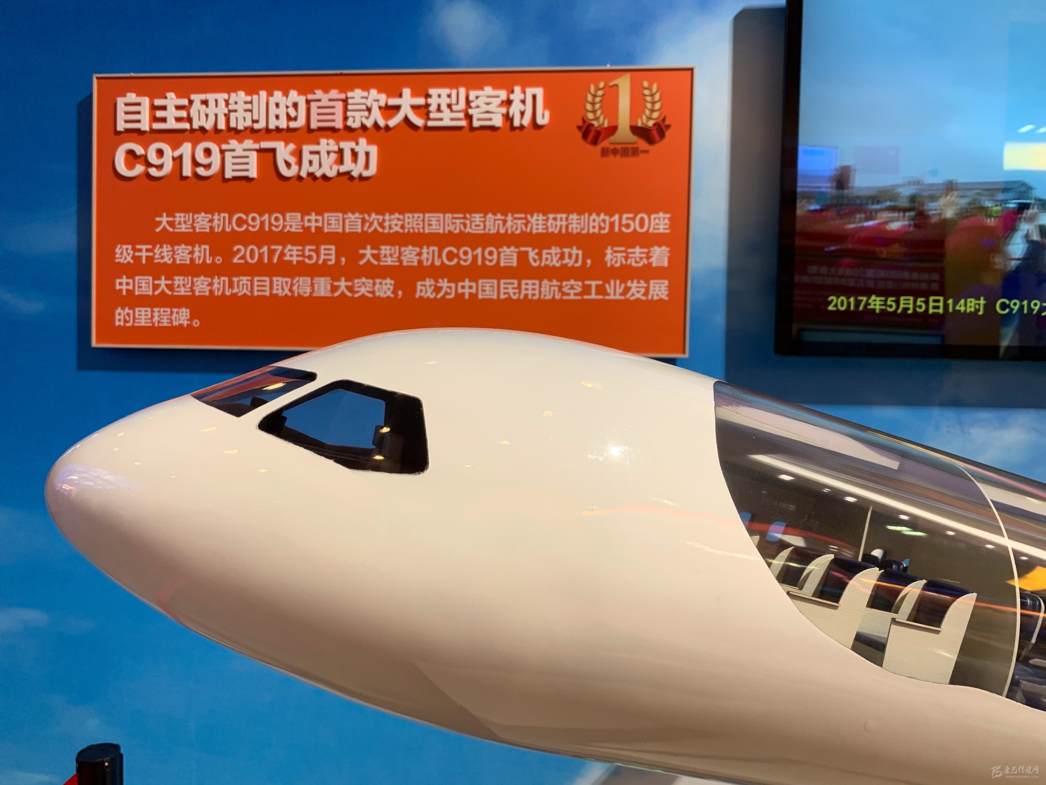 在2017年展區(qū),C919大飛機(jī)模型,配合解說圖片以及總裝下線當(dāng)日的視頻展出。