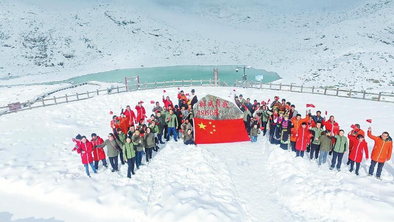 達(dá)古冰川管理局干部職工在海拔4860米的雪山之巔舉行“升國旗、唱國歌、慶國慶”活動(dòng)。銀琪攝