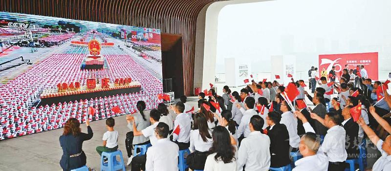 上午10時(shí),慶祝中華人民共和國成立70周年大會(huì)開始。通過電視信號(hào),大會(huì)盛況傳遞至每個(gè)現(xiàn)場(chǎng)?!芭c祖國母親同在,祝福祖國繁榮昌盛?!边@是大家共同的心聲?!醣緢?bào)記者 林凌 何勤華 程文雯 徐中成 陳碧紅 文莎