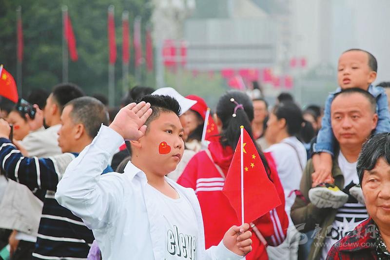 在內(nèi)江市大洲廣場(chǎng),許多市民臉上貼著國旗,歡欣地?fù)]動(dòng)著手中的五星紅旗。當(dāng)慷慨激昂的國歌響起,全場(chǎng)人員唱起國歌,對(duì)偉大祖國致以無限敬意和深深祝福。