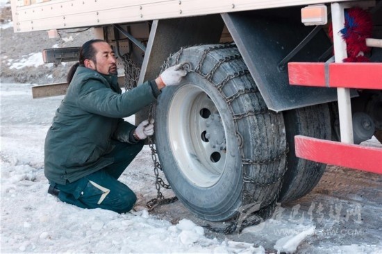 其美多吉在途中幫助社會車輛安裝防滑鏈(資料照片)。其美多吉是中國郵政甘孜縣分公司郵運駕駛組的一名郵車司機,往返在甘孜縣與德格縣之間。這段路程是四川省甘孜州綿延5866公里、平均海拔超過3500米的雪線郵路最危險的一段。新華社發(fā)(周兵 攝)