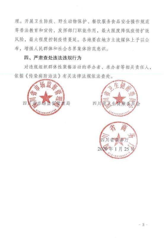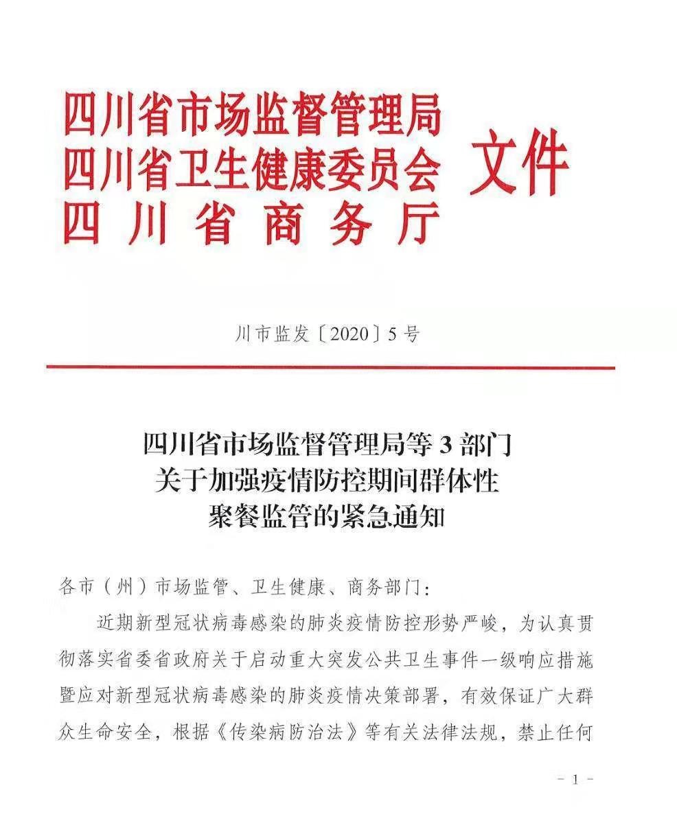 四川新聞網(wǎng)成都1月25日訊(記者 李丹)1月25日,四川省市場(chǎng)監(jiān)督管理局、四川省衛(wèi)生健康委員會(huì)、四川省商務(wù)廳3部門聯(lián)合發(fā)布緊急通知,近期新型冠狀病毒感染的肺炎疫情防控形勢(shì)嚴(yán)峻,為認(rèn)真貫徹落實(shí)省委省政府關(guān)于啟動(dòng)重大突發(fā)公共衛(wèi)生事件一級(jí)響應(yīng)措施暨應(yīng)對(duì)新型冠狀病毒感染的肺炎疫情決策部署,有效保證廣大群眾生命安全,根據(jù)《傳染病防治法》等有關(guān)法律法規(guī),禁止任何餐飲單位和個(gè)人舉辦任何形式的群體性聚餐活動(dòng),已經(jīng)訂餐的應(yīng)盡快取消或延期舉辦。
