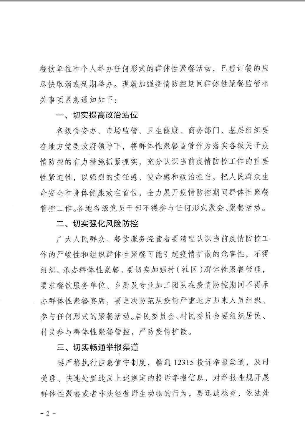 各級(jí)食安辦、市場(chǎng)監(jiān)管、衛(wèi)生健康、商務(wù)部門、基層組織要在地方黨委政府領(lǐng)導(dǎo)下,將群體性聚餐監(jiān)管作為落實(shí)各級(jí)關(guān)于疫情防控的有力措施抓緊抓實(shí),充分認(rèn)識(shí)當(dāng)前疫情防控工作的重要性緊迫性,以強(qiáng)烈的責(zé)任感、使命感和政治擔(dān)當(dāng),把人民群眾生命安全和身體健康放在首位,全力展開疫情防控期間群體性聚餐管控工作。各地各級(jí)黨員干部不得參與任何形式聚會(huì)、聚餐活動(dòng)。