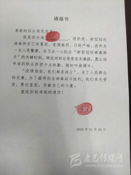 四川新聞網(wǎng)成都1月31日訊(記者 文驥 攝影報道) “疫情面前,我們都是戰(zhàn)士,為了人民群眾的安康,為了贏得抗擊病毒戰(zhàn)斗勝利,我們責無旁貸……”尹彥奎是成都交警四分局的一名黨員交警,1月26日,他向分局黨總支遞交了一份請戰(zhàn)書,還按上了手印。
