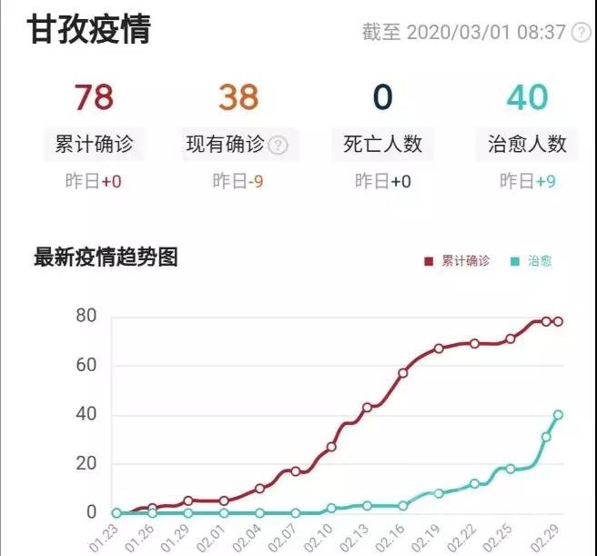截至2月29日24時,我州累計報告確診病例78例,累計治愈出院40人(道孚縣35人、康定市2人、色達縣2人、稻城縣1人),其余38人(重癥4例,危重癥1例)均在定點醫(yī)院隔離治療,231名密切接觸者正在接受醫(yī)學(xué)觀察。我州除道孚縣“五鄉(xiāng)一鎮(zhèn)”外,其余17個縣(市)連續(xù)26天無確診病例報告。