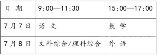 全省高考(一類模式高考除外)于7月7、8日統(tǒng)一組織進(jìn)行。各科目考試時(shí)間(北京時(shí)間)安排如下: