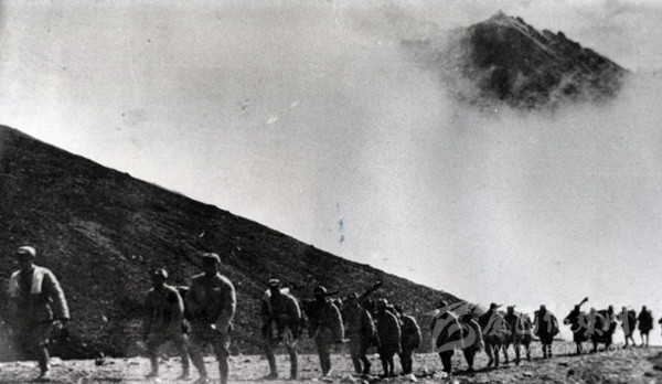 圖為進(jìn)軍西藏途中的十八軍戰(zhàn)士,背后是高聳入云的山峰。圖片來(lái)源:網(wǎng)絡(luò)