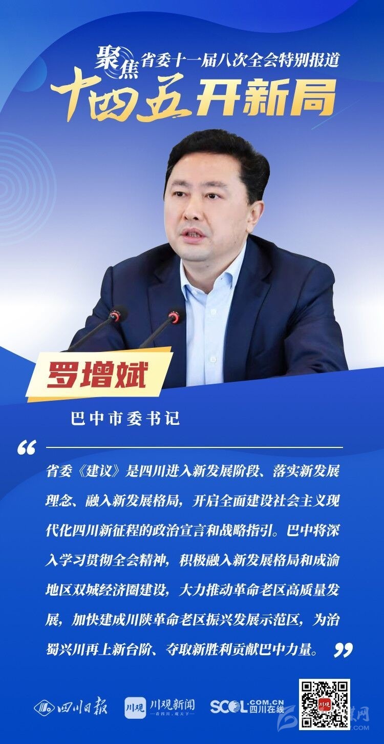 12月3日,中共四川省委十一屆八次全會在成都開幕,全會將深入學習貫徹黨的十九屆五中全會精神,審議《中共四川省委關于制定四川省國民經(jīng)濟和社會發(fā)展第十四個五年規(guī)劃和二〇三五年遠景目標的建議(討論稿)》,為未來5年乃至更長時期四川發(fā)展謀劃新藍圖 。