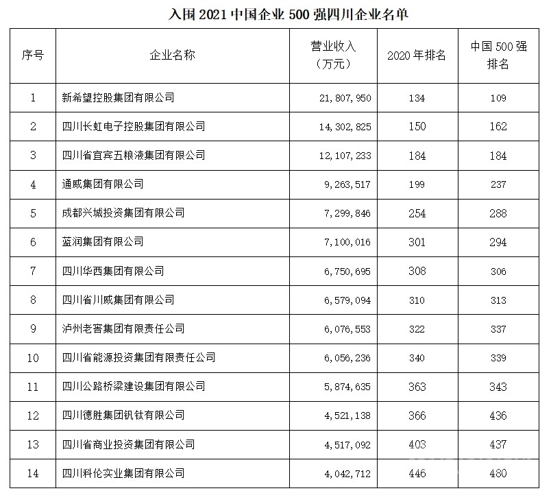 2021年四川有14家四川企業(yè)入圍中國(guó)企業(yè)500強(qiáng),較上年減少1家。新希望控股集團(tuán)有限公司以21,807,950萬元的營(yíng)收成為進(jìn)入中國(guó)500強(qiáng)的四川企業(yè)首位,總排名109位,比去年上升25位。其余入圍企業(yè)名單如下。