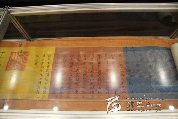 據(jù)介紹,明成祖永樂十一年封誥為國家一級文物,系明永樂帝成祖朱棣于明永樂十一年(1413)敕封噶瑪噶舉楚布寺第二世司徒活佛曲吉降村為“灌頂圓通妙濟(jì)國師”時頒賜的。該封誥質(zhì)地為宮廷誥文專用彩色云綾紋錦,由藍(lán)、明黃、白、灰、褐五色錦帛分段依次裱接為手卷形制。封誥用漢藏兩種文字墨書,漢文居右、直行,共20行、145字、楷書;藏文居左、橫行、共四行、行書。封誥右藍(lán)色錦帛織二龍及“奉天誥命”四字。該封誥真實(shí)地記載了明王朝敕封噶瑪噶舉派高僧,有效管理藏區(qū)地方事務(wù)的史實(shí),對研究明代中央王朝與藏區(qū)關(guān)系具有重要的史料價值。