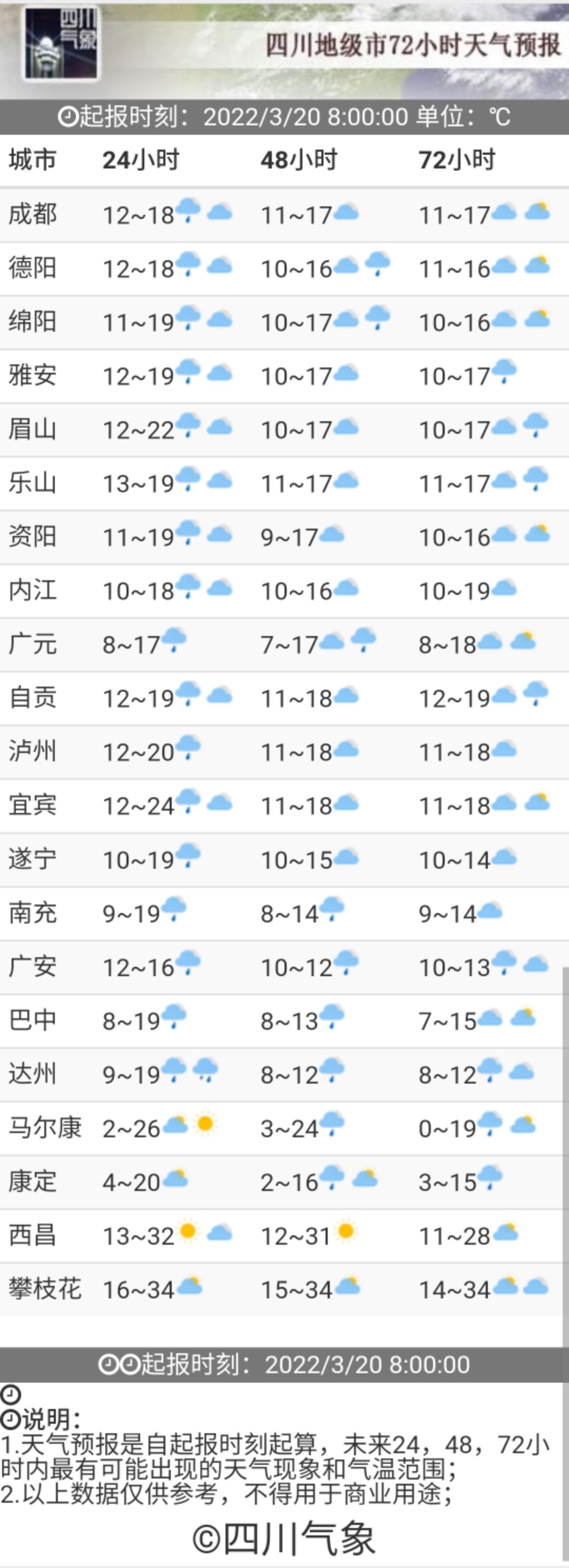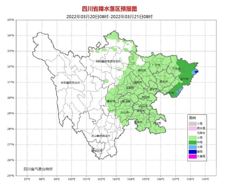 早在3月18日,四川省氣象臺便發(fā)出了強(qiáng)降溫黃色預(yù)警。預(yù)計19日傍晚~22日,盆地和涼山州東北部將有一次明顯的降溫降雨天氣過程,日平均氣溫將累計下降7~12℃,最高氣溫將下降15℃或以上;冷空氣影響時有3-5級偏北風(fēng),山口河谷風(fēng)力可達(dá)6級或以上,局部地方有短時強(qiáng)降水、雷暴大風(fēng)或冰雹等強(qiáng)對流天氣,其中盆地東北部、中部和南部有大雨到暴雨。