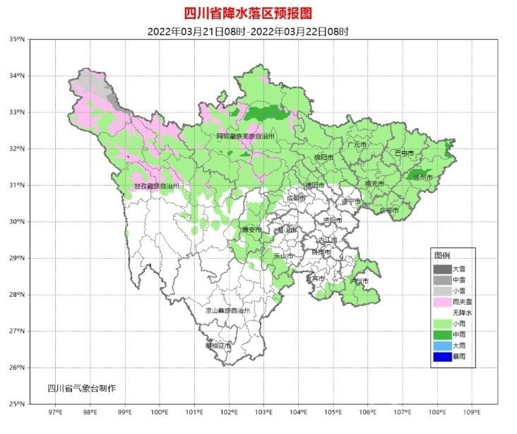 21日白天到晚上,盆地各市陰天間多云,廣元、綿陽、德陽、巴中、達(dá)州、南充、廣安、瀘州、雅安9市和成都西部、樂山南部有小雨,其中達(dá)州局部有中雨;阿壩州和甘孜州北部、涼山州東北部多云間陰有陣雨(雪),局地中雨(雪),甘孜州南部和攀西其余地方多云見晴。