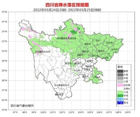 今天(3月24日)晚上,廣元、綿陽、德陽、成都、巴中、達(dá)州、廣安、南充、遂寧、瀘州10市和雅安東部有小雨,盆地其余地方陰天;阿壩州大部、甘孜州北部陰天間多云有小雨(雪),其中阿壩州東部有中雨(雪),甘孜州其余地方和攀西地區(qū)多云間晴。