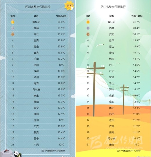 3月23日(左圖)與3月22日(右圖)四川各城市實(shí)況氣溫對(duì)比。