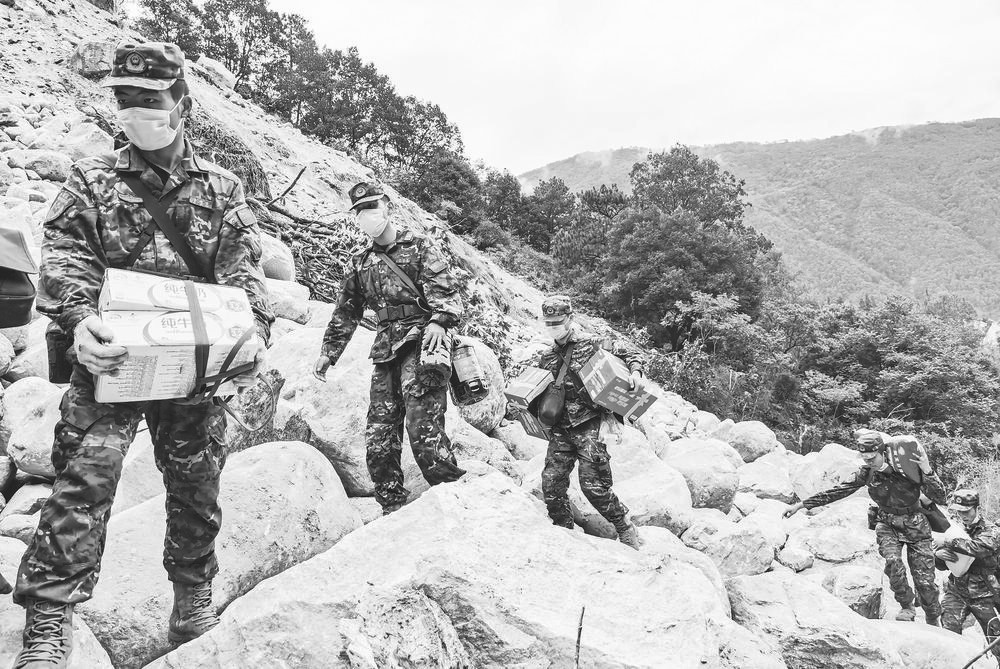 在地震發(fā)生后的48小時內,救援隊伍拼盡全力在水流湍急的河面搭設便橋,在不可能通行的地方,奮力開辟出一條生命通道,一箱箱應急救援物資靠肩扛人背送往共和村,部分急需轉移的鄉(xiāng)親被一支支救援隊伍及時送到安全地帶,妥善安置。