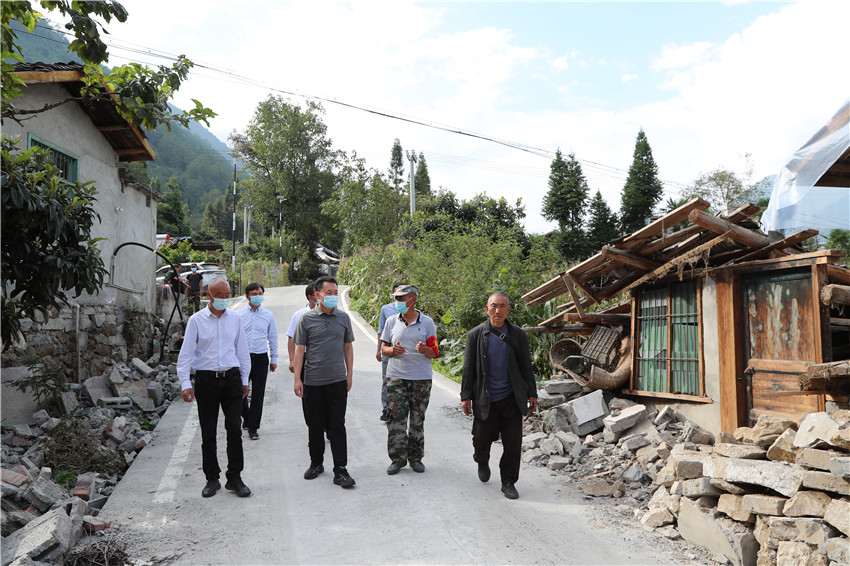 沈陽(yáng)在磨子溝村察看房屋道路等損壞情況。