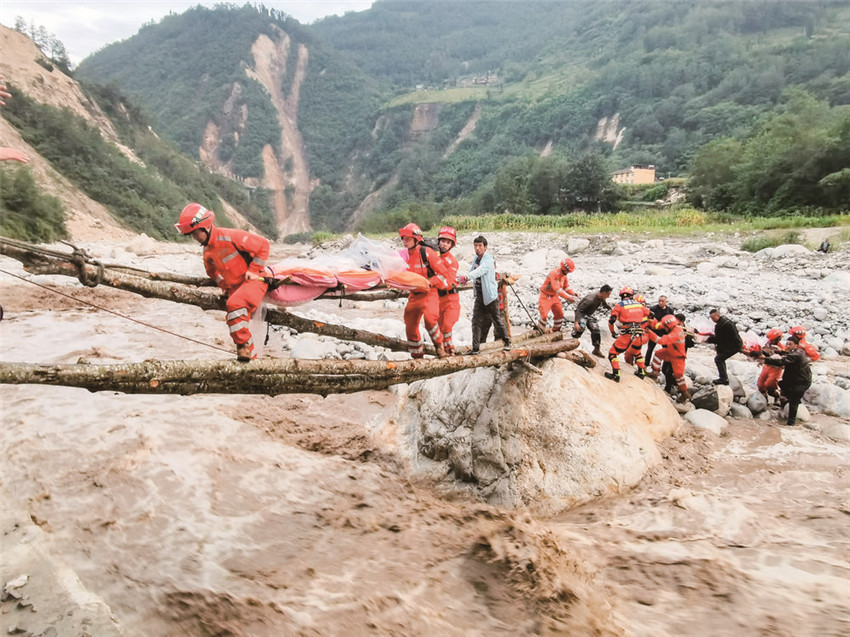 道路中斷、信號(hào)中斷,河流上漲、橋梁垮塌?!皼]有橋,我們的雙手就是橋?!标P(guān)鍵時(shí)刻,四川省森林消防總隊(duì)甘孜支隊(duì)消防員兵分兩路實(shí)施營(yíng)救。一路“繩為引、步為尺”先期過河救治傷員,一路就地取材急流上用樹干搭起“生命通道”,自制擔(dān)架將傷員一一運(yùn)送過河;截至5日晚23時(shí)40分,甘孜森林消防隊(duì)員們翻山越嶺往返近7小時(shí),安全轉(zhuǎn)運(yùn)重傷員24人、近200名群眾,徒步行程18公里。