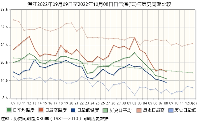 在盆地區(qū),溫江國(guó)家氣象站的觀測(cè)顯示,10月2日以來,當(dāng)?shù)氐娜掌骄鶜鉁?、日最高氣溫、日最低氣溫都是一路快速下行,使前期偏高的氣溫向著歷史均值快速回歸。