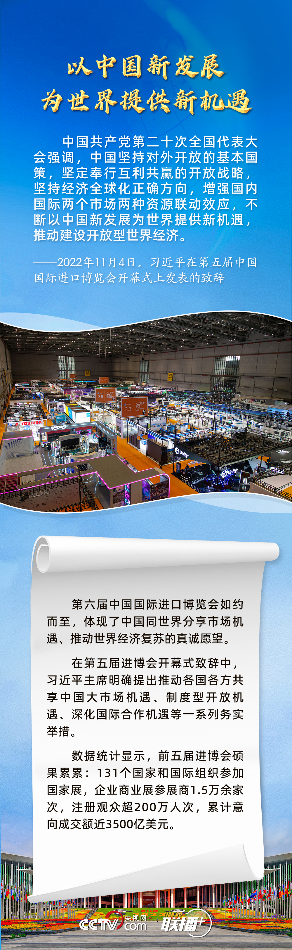 聯(lián)播+11月5日,第六屆中國(guó)國(guó)際進(jìn)口博覽會(huì)在上海開(kāi)幕。習(xí)近平主席在致信中指出,2018年以來(lái),進(jìn)博會(huì)成功舉辦五屆,依托中國(guó)大市場(chǎng)優(yōu)勢(shì),發(fā)揮國(guó)際采購(gòu)、投資促進(jìn)、人文交流、開(kāi)放合作平臺(tái)功能,對(duì)加快構(gòu)建新發(fā)展格局和推動(dòng)世界經(jīng)濟(jì)發(fā)展作出了積極貢獻(xiàn)。