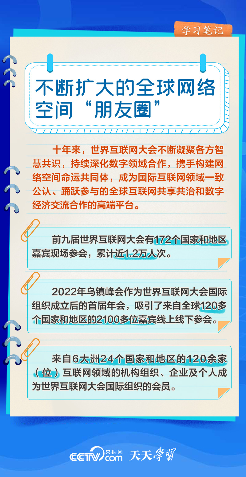 前九屆世界互聯(lián)網(wǎng)大會(huì),習(xí)近平主席或親臨現(xiàn)場(chǎng)發(fā)表主旨演講,或視頻致辭,或向大會(huì)發(fā)來賀信,以不同形式關(guān)心大會(huì)舉辦。央視網(wǎng)《天天學(xué)習(xí)》欄目推出學(xué)習(xí)筆記,與您一起了解世界互聯(lián)網(wǎng)大會(huì)的十年“網(wǎng)”事。
