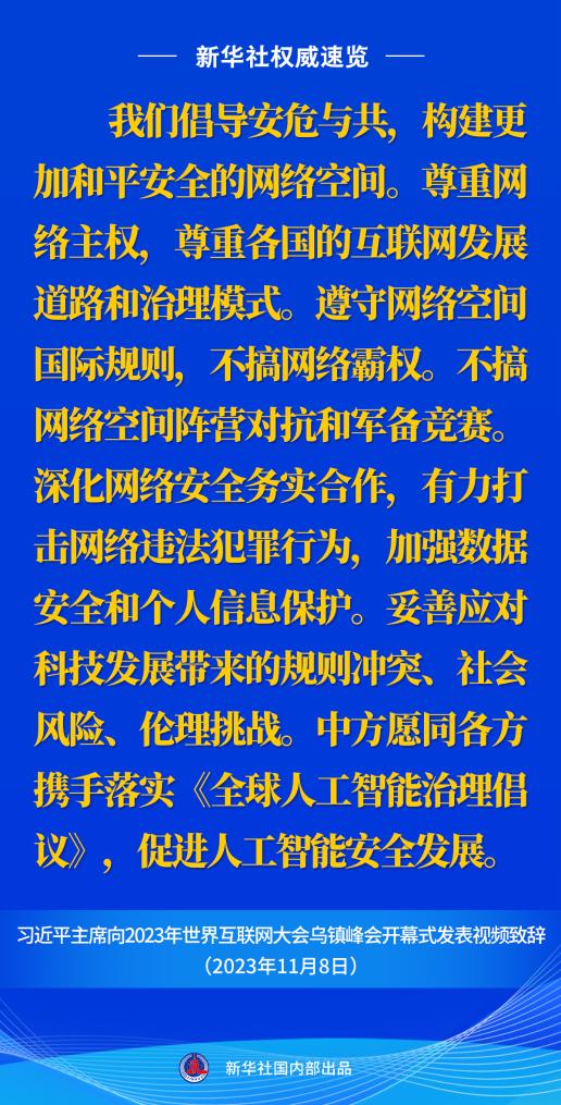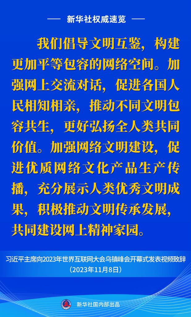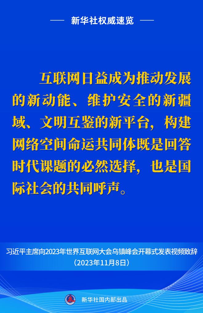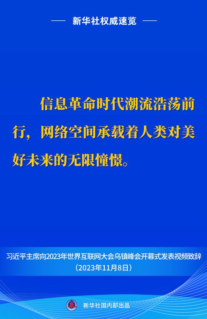 11月8日上午,國家主席習(xí)近平向2023年世界互聯(lián)網(wǎng)大會烏鎮(zhèn)峰會開幕式發(fā)表視頻致辭。一起來看金句。