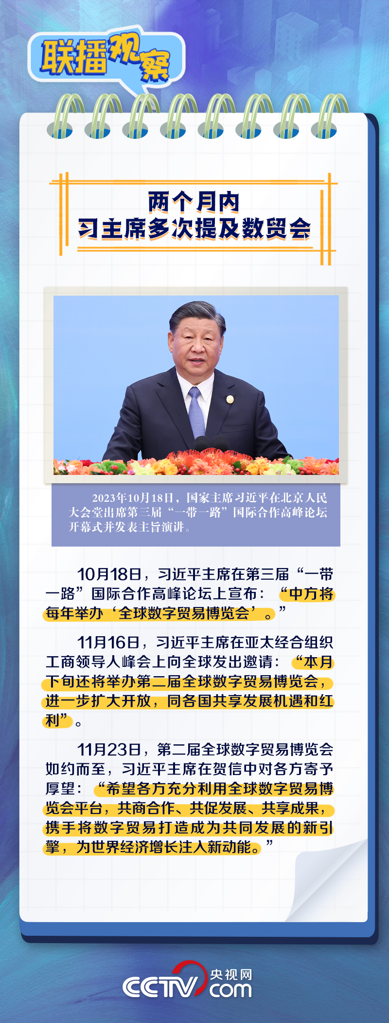 第二屆全球數(shù)字貿(mào)易博覽會11月23日至27日在浙江杭州舉辦。數(shù)字貿(mào)易是數(shù)字經(jīng)濟(jì)的重要組成部分。近年來,就做強(qiáng)做優(yōu)做大數(shù)字經(jīng)濟(jì)、推動數(shù)字貿(mào)易改革創(chuàng)新發(fā)展,習(xí)近平主席多次作出重要闡述,一起來學(xué)習(xí)!