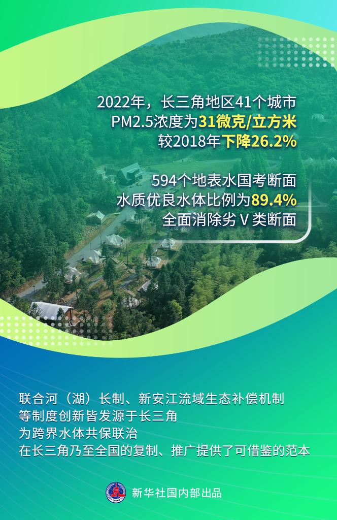 2022年,長三角地區(qū)41個城市PM2.5濃度為31微克/立方米,較2018年下降26.2%。594個地表水國考斷面水質(zhì)優(yōu)良水體比例為89.4%,全面消除劣Ⅴ類斷面。