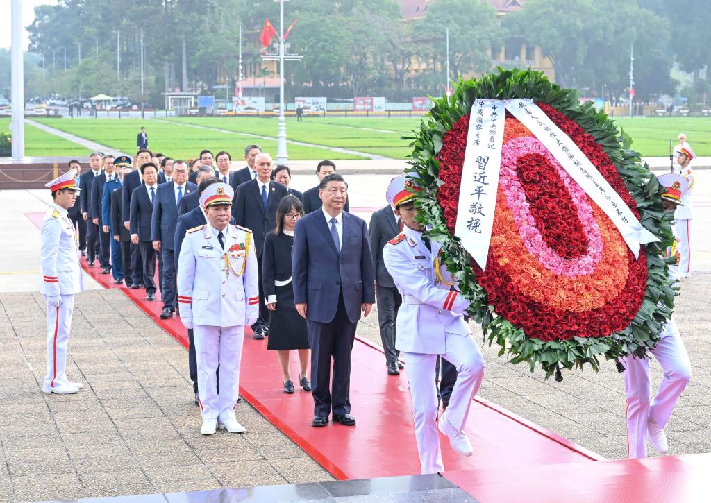 13日上午,習(xí)近平總書記在河內(nèi)瞻仰胡志明陵并敬獻(xiàn)花圈。