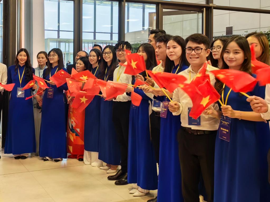 習(xí)近平總書記和夫人彭麗媛抵達(dá)國(guó)家會(huì)議中心時(shí),受到越方青年代表熱烈歡迎。