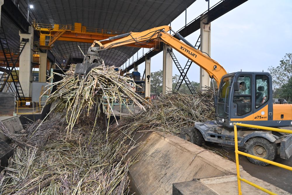 12月14日,在廣西來賓東糖鳳凰有限公司,員工操作機械將甘蔗投入傳送帶,準備送往壓榨車間。