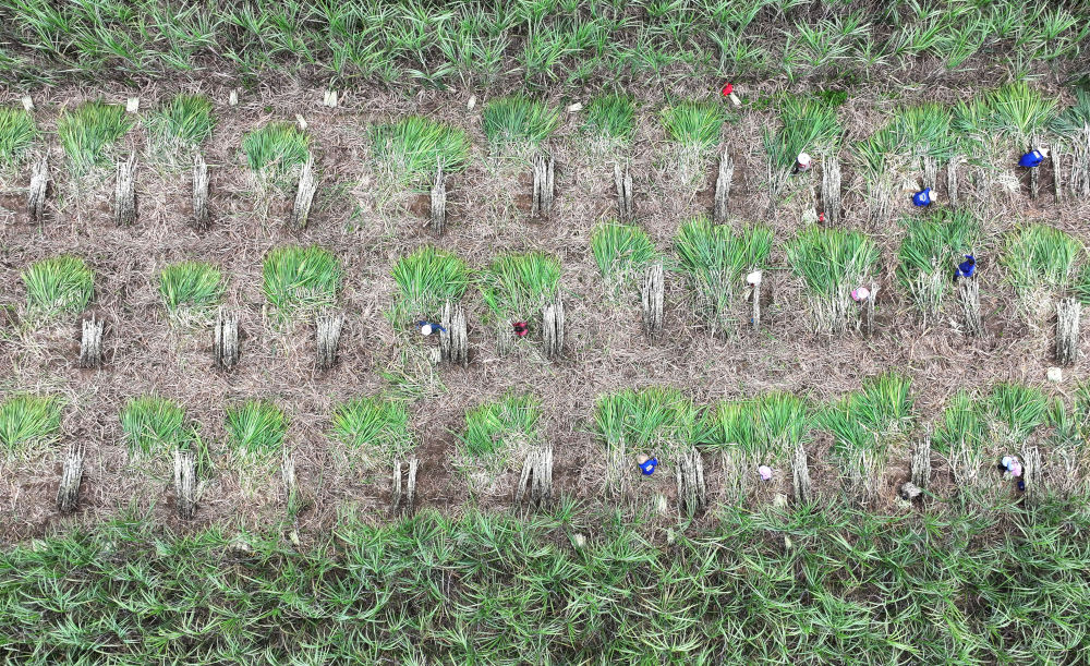 12月12日,在來賓市興賓區(qū)小平陽鎮(zhèn),農民在收割甘蔗(無人機照片)。